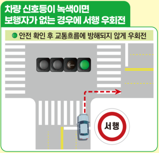 - 적색인 경우는 정지하고, 녹색화살표가 점등되면 우회전한다.
