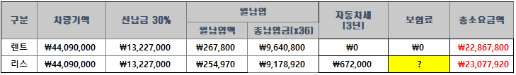 총 소요비용은 월 렌트/리스 비용 + 30% 선납금이 36개월간 들어간 금액이 되고, 보험료와 세금을 별도로 내야하는 리스를 하는 경우가 비용이 더 소요됩니다.