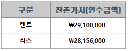 같은 차량에 렌트와 리스의 잔존가치금액(인수 시 지불)은 같지는 않지만 비슷합니다.