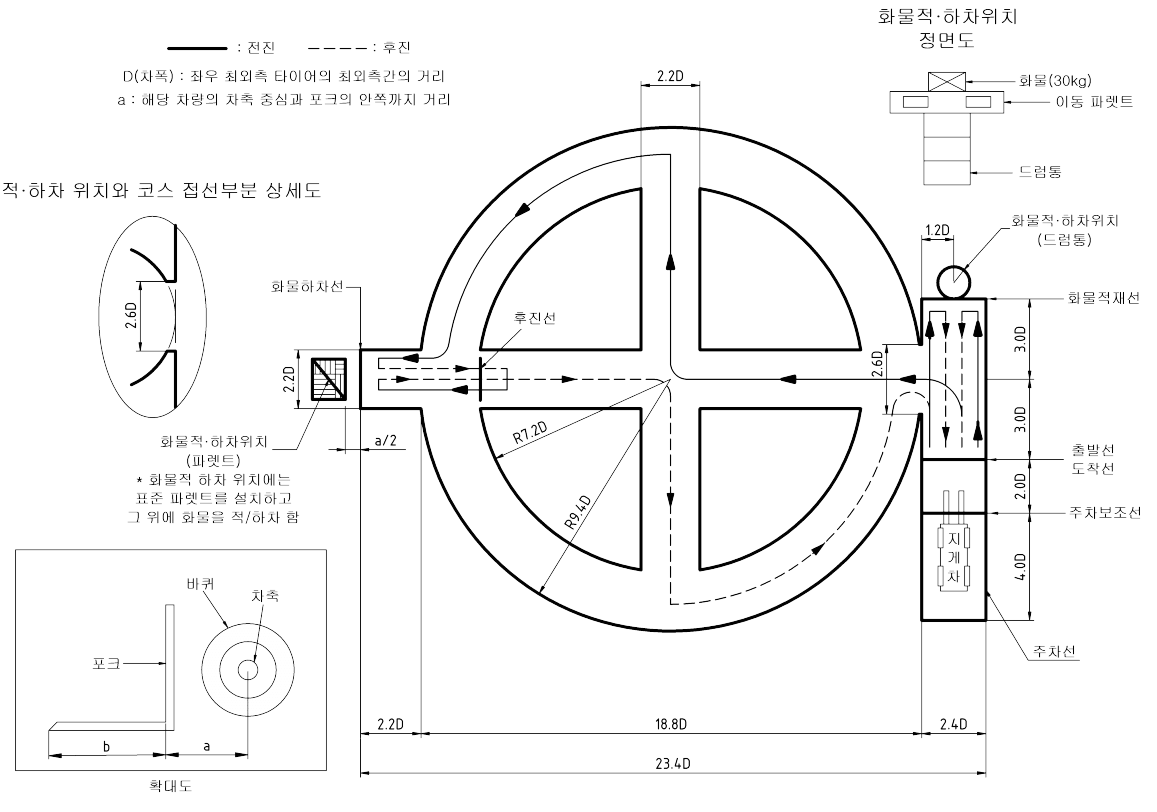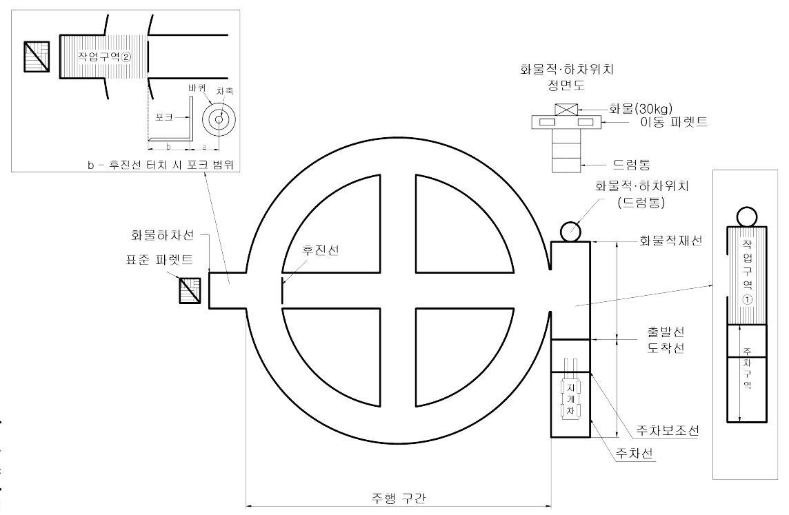 - 포크 수평상태 지면에서 20~30 cm 상승하여 전진 출발선 통과