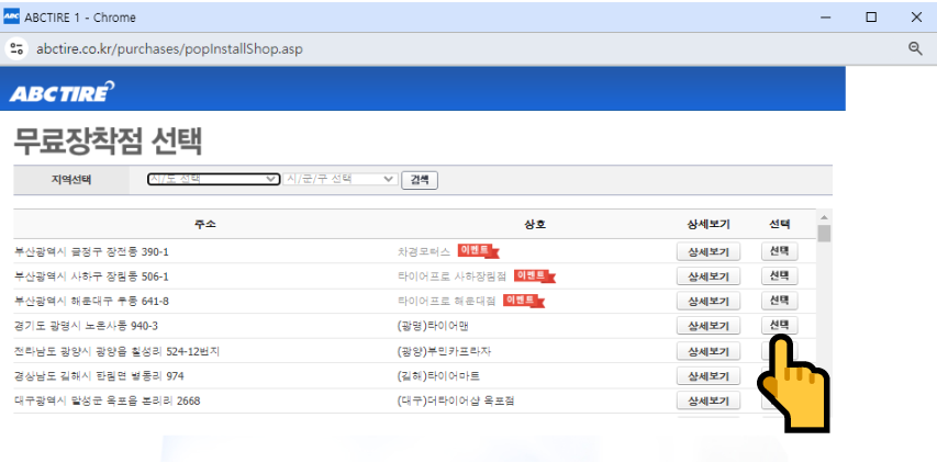 무료장착점 지역을 선택하고 검색을 하면, 가까운 업소 목록이 나옵니다. 우측 끝의 선택 버튼을 눌러서 배송지를 확정합니다.