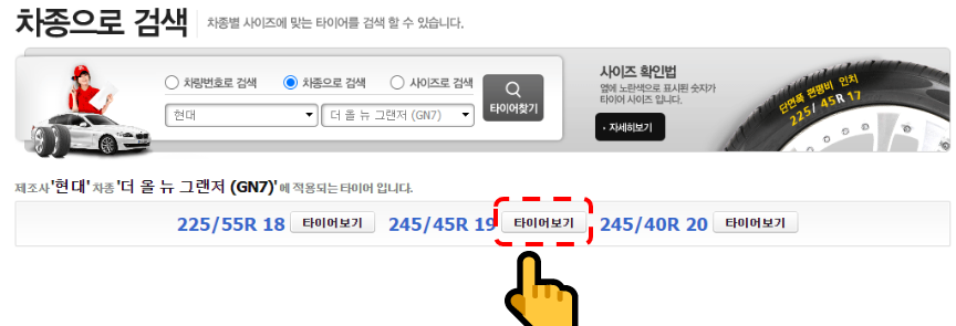 검색하는 방법은 차종으로 하는 방법과 타이어 사이즈를 알고 있는 경우 타이어 사이즈로 검색합니다.