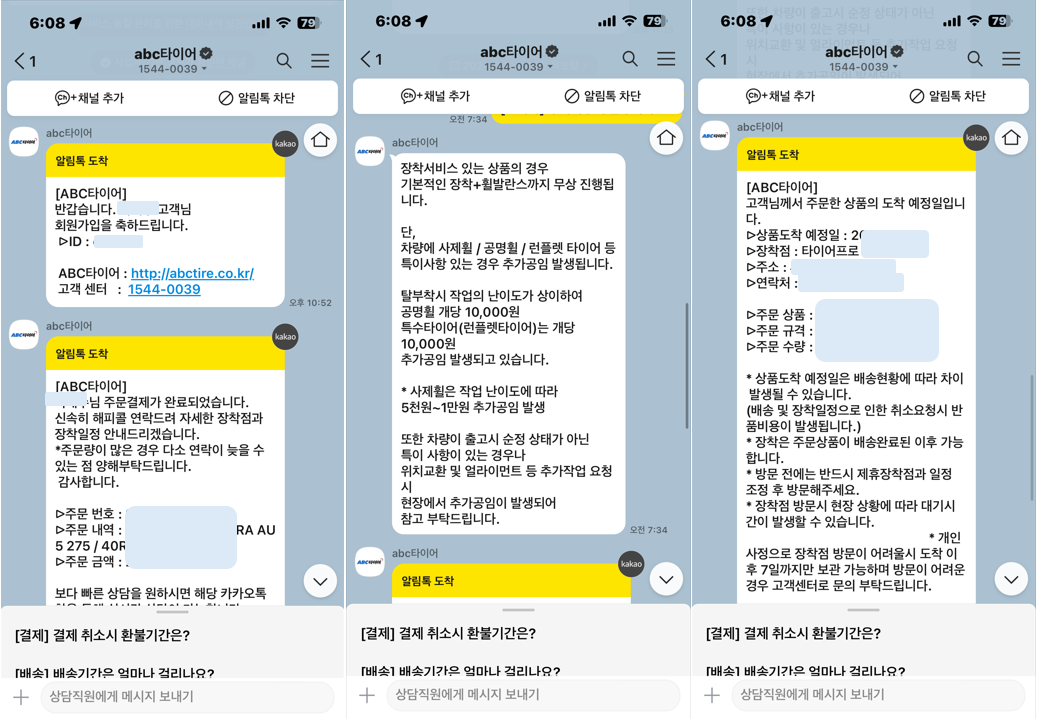 ABC타이어에 회원가입과 주문을 하고 나면 카톡 메세지가 오게 됩니다. (아래 사진)