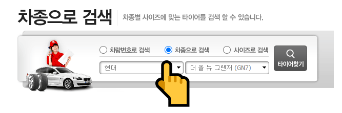 차종으로 검색을 선택하고 브랜드명과 차종을 선택하고 타이어 찾기 버튼을 클릭합니다.