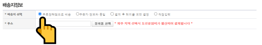 주문자정보 아래에 배송지 정보를 입력하는 창이 나오면, 아래와 같이 무료장착점으로 배송을 선택하고 '장착점 선택' 버튼을 눌러줍니다.