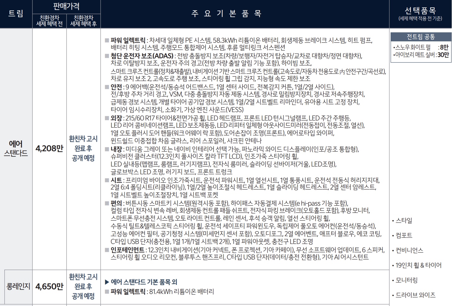 옵션은 에어 스탠다드의 기본 사양(4,208만원)에서 모델변경 및 옵션을 추가할 수 있습니다.