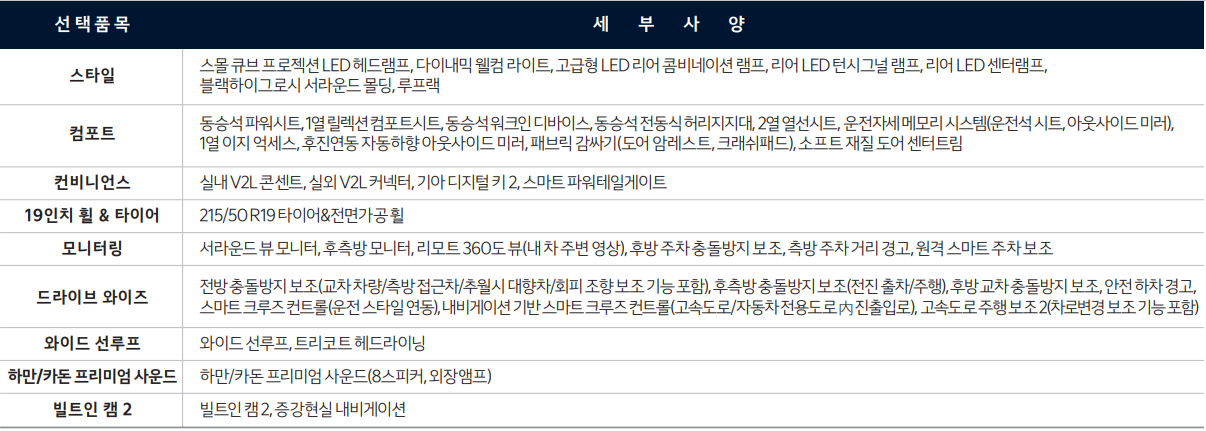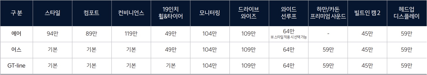 추가 선택사양에 나오는 옵션의 가격은 각각 작게는 45만원에서 119만원까지가 있습니다.