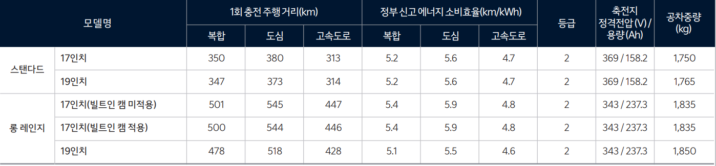 - 롱레인지 모델의 경우 1,835 ~ 1,850 kg